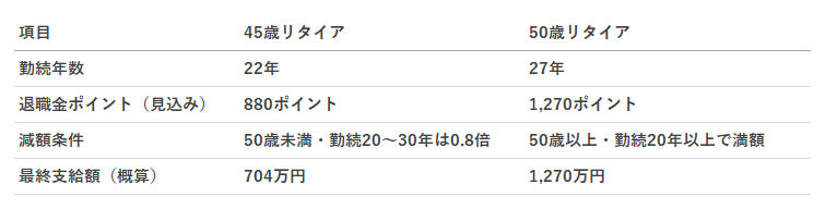 今回は、45歳でリタイアした場合と、50歳まで働いた場合で退職金がどのくらい変わるのかを、会社の規定に基づいてシミュレーションしてみました。
