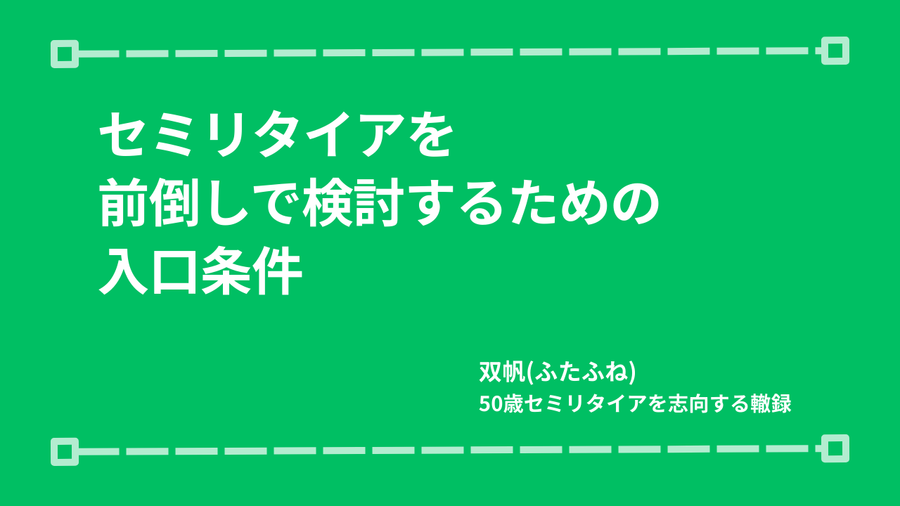 この二つの変数が決まれば、セミリタイア前倒しの検討は現実味を帯びてきますし、逆にどちらかが決まっていない段階では、検討そのものが成立しない対象であるように思います。