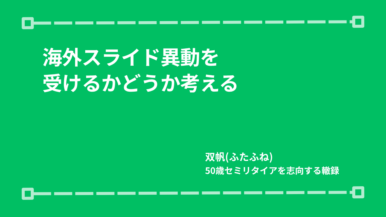 前回の記事で触れた通り、海外スライド異動の話が現実味を帯びてきています。